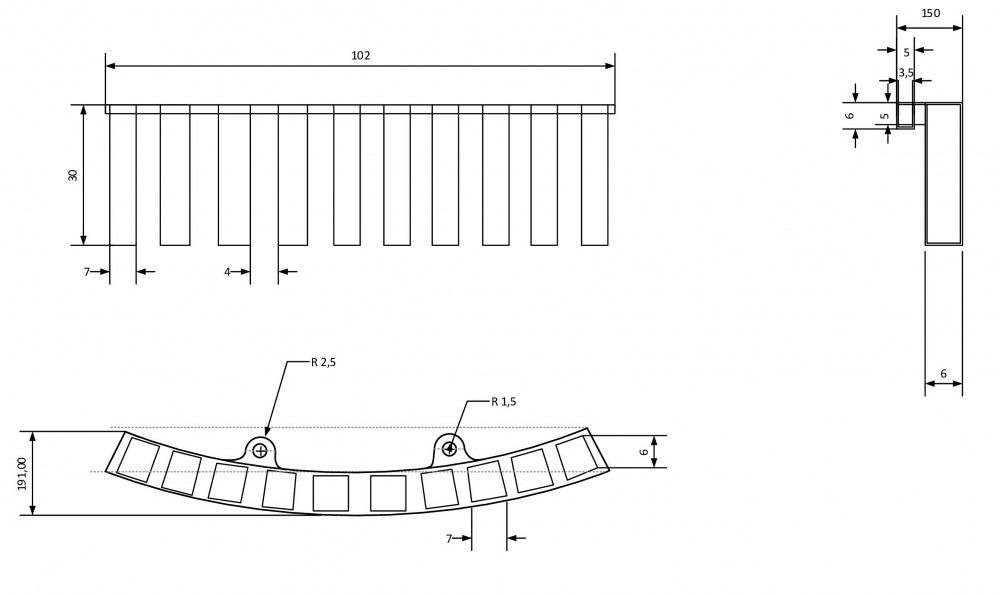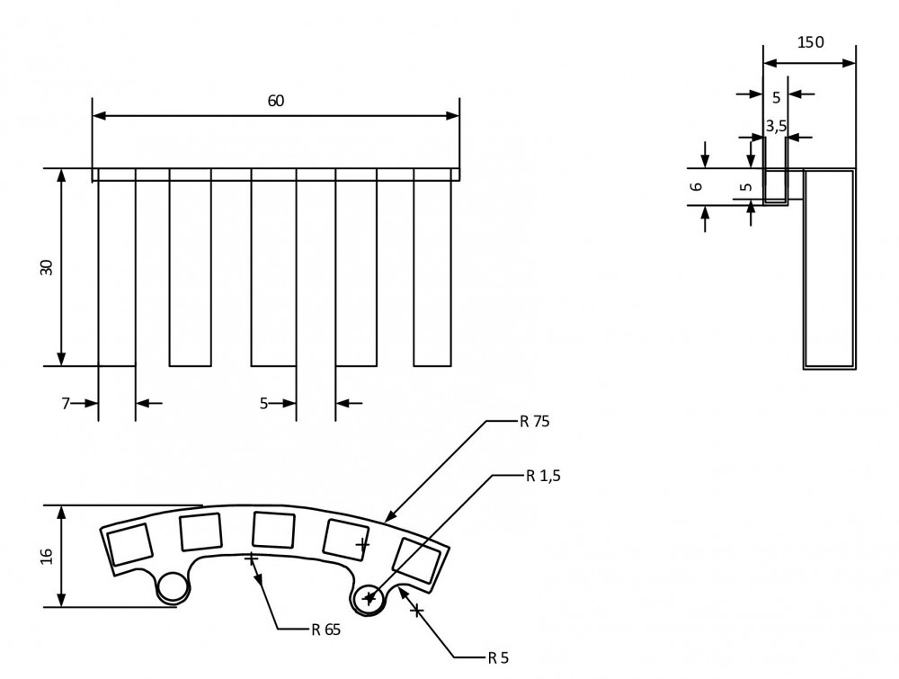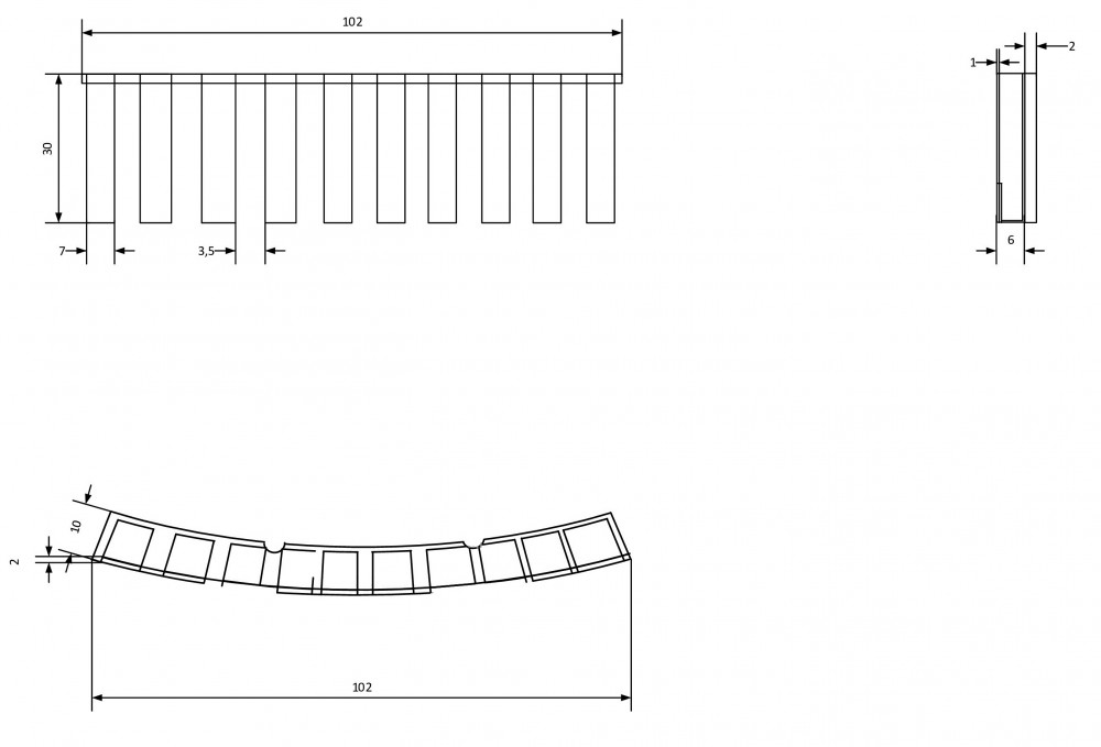- Длина 98 мм, высота 28 мм, ширина 6 мм. С 6-ью фиксаторами, расположенными параллельно 1-2 и 5-6, 9-10 ячейками. Длина фиксаторов 8 мм. Ширина 8 мм с фиксаторами, с ребрами жесткости по внешнему краю с толщиной 0.5 мм
