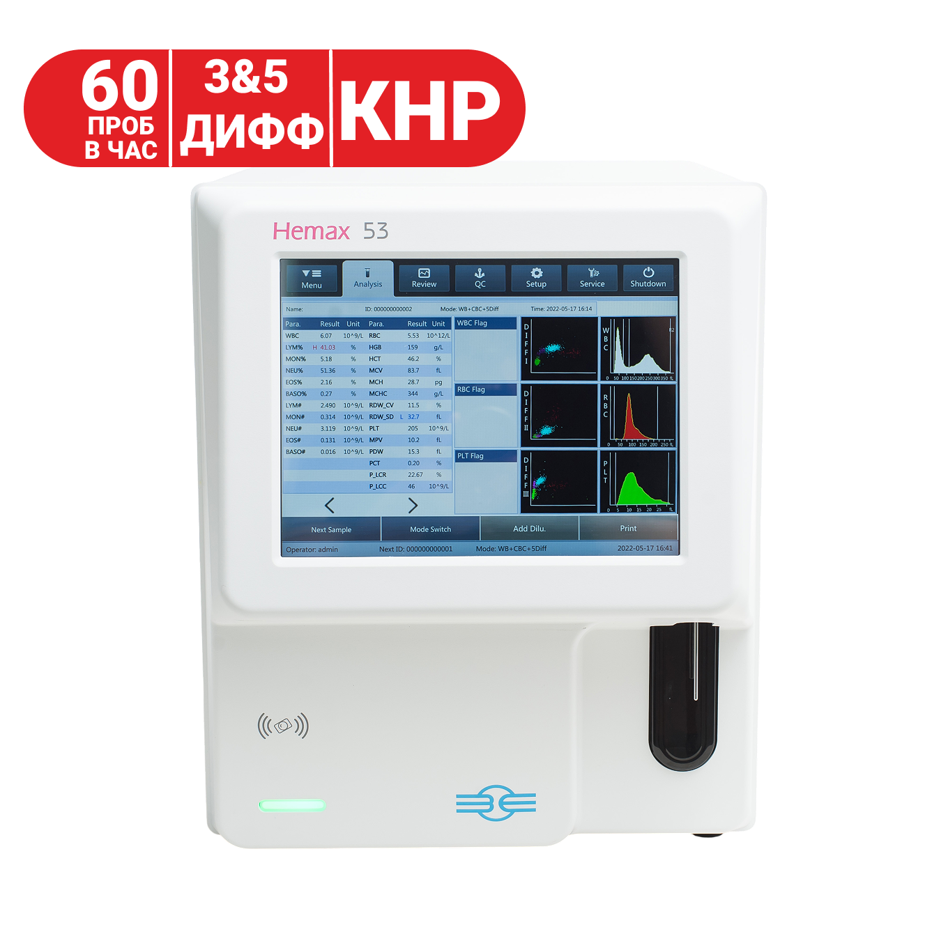 - Возможность выполнения анализа крови как в режиме 5-ДИФФ, так и 3-ДИФФ. Переход на выполнение анализа в режиме 3-ДИФФ обеспечивает значительную экономию на стоимости анализа.