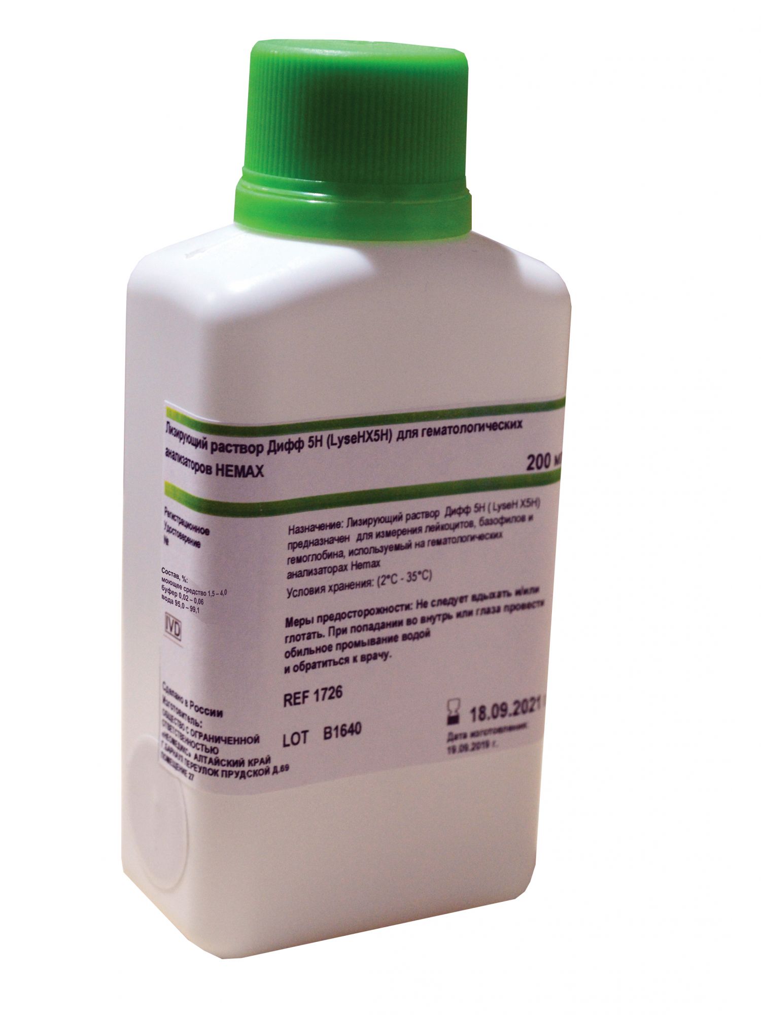 Лизирующий раствор Дифф 5H (Lyse-HX5H) расфасован во флаконы объемом 0,2 л.