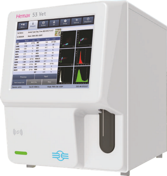HEMAX 53 VET — ветеринарный автоматический гематологический анализатор | B&E BIO-TECHNOLOGY CO., LTD. (Китай) Гематологический автоматический анализатор Хемакс 53 Вет способен производить до 60 тестов за один час, исследует кровь по 23 параметрам и строит 2 гистограммы (RBC и PLT) и 2 Diff диаграммы рассеяния образцов крови. Встроенные профили для диагностики кошек и собак. Кроме того, пользователь может назначить 10 собственных профилей.