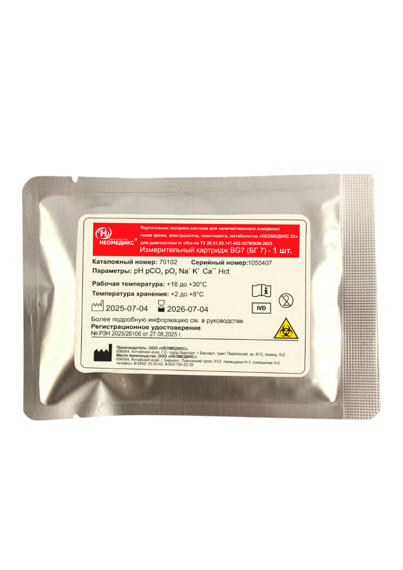 Картридж: БГ 7 (BG 7) — измерительный картридж для анализатора газов крови "НЕОМЕДИКС 22"