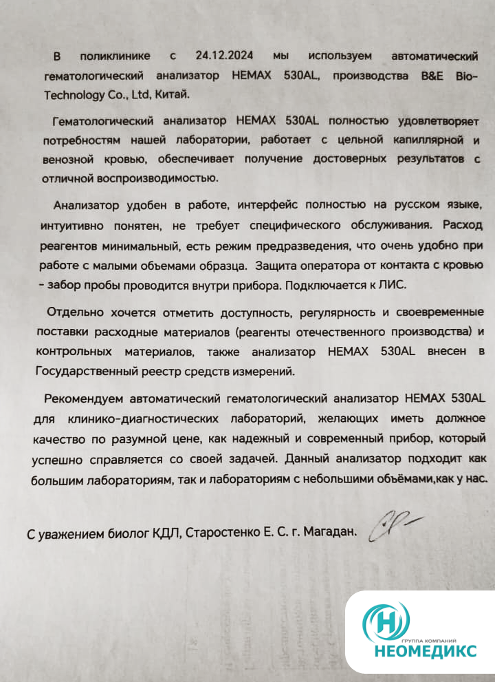 Клиника из Магадана поделилась положительным опытом работы с гематологическим анализатором НЕМАХ 530AL, отметив его высокую производительность, удобство использования и экономичность.