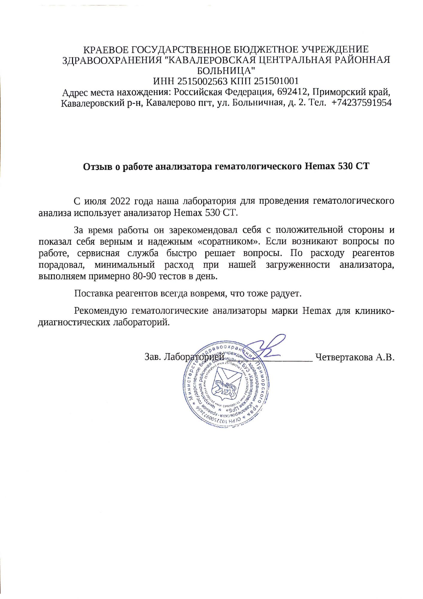 За время работы он зарекомендовал себя с положительной стороны и показал себя верным и надежным «соратником». Если возникают вопросы по работе, сервисная служба быстро решает вопросы. По расходу реагентов порадовал, минимальный расход при нашей загруженности анализатора, выполняем примерно 80-90 тестов в день.