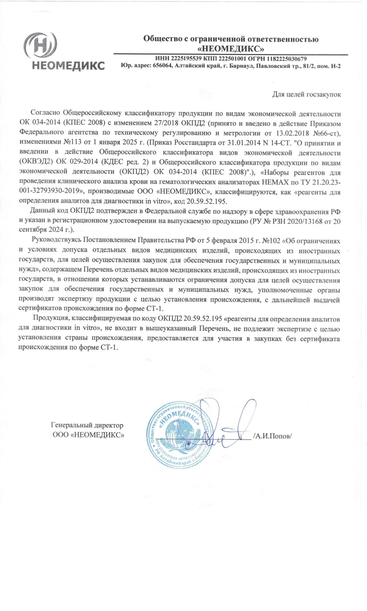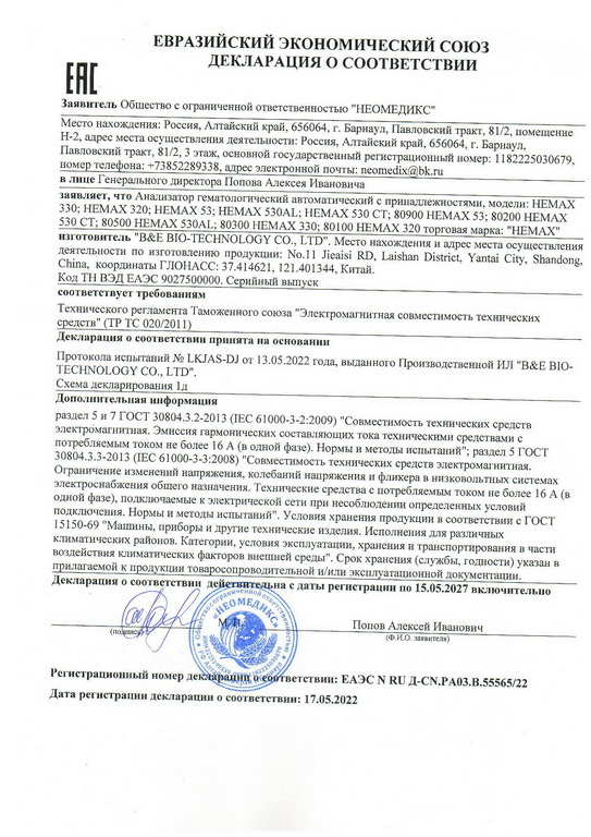 ООО «НЕОМЕДИКС» является уполномоченным представителем B&E Bio-Technology Co., Ltd – китайского производителя гематологических анализаторов HEMAX в России (Регистрационное удостоверение РУ № 2022/16466 от 1 февраля 2022), а также российским производителем реагентов для анализаторов HEMAX (Регистрационное удостоверение РУ № 2020/13168 от 20 сентября 2024).