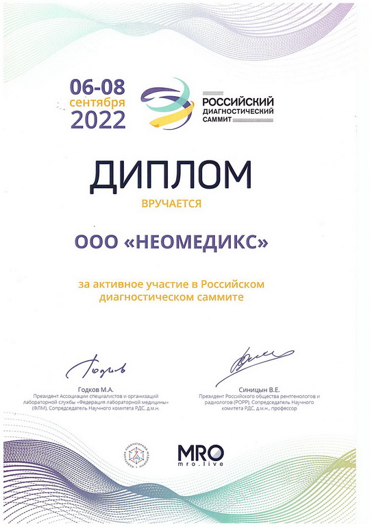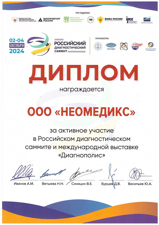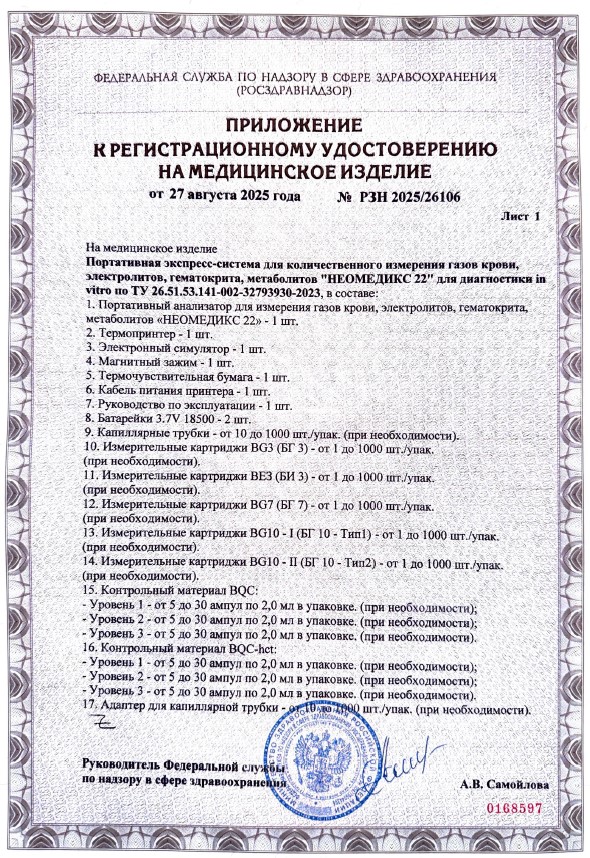 В августе 2025 года было получено регистрационное удостоверение на портативную экспресс-систему для количественноо измерения газов крови, электролитов, гематокрита, метаболитов "НЕОМЕДИКС 22" для диагностики in vitro по ТУ 26.51.53.141-002-327939-30-2023, производства ООО "НЕОМЕДИКС" (РУ №РЗН 2025/26106 от 27.08.2025 г.)