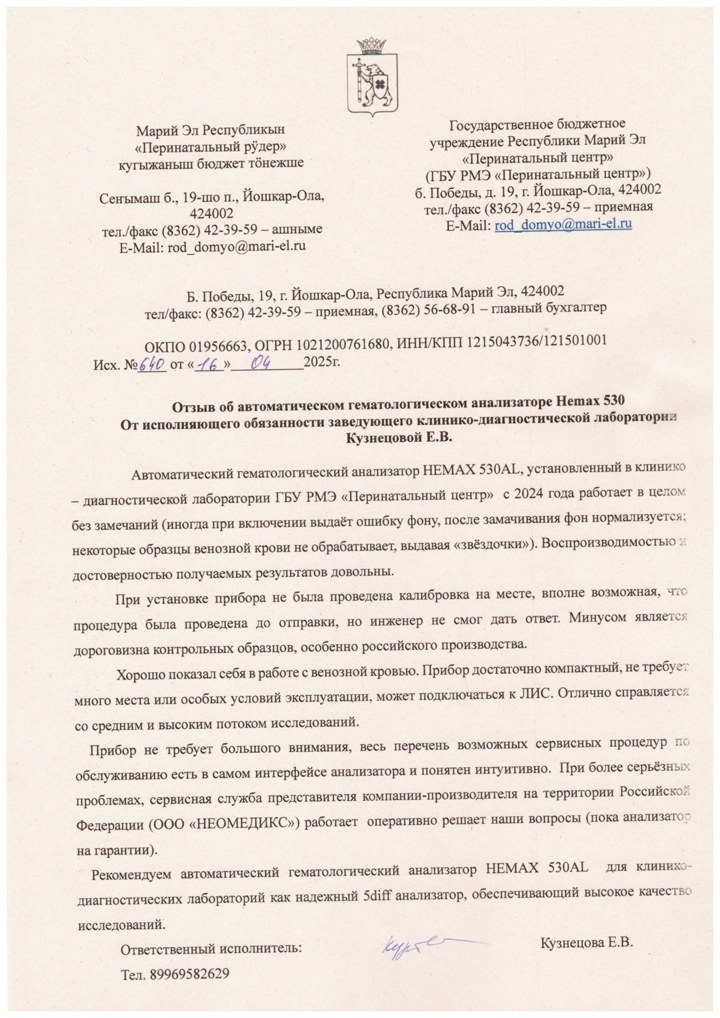 За время работы анализатор зарекомендовал себя, как надежный и простой в эксплуатации прибор. Сбоев в работе прибора не наблюдалось. Показаниями получаемых результатов довольны, отвечают требованиям лаборатории, предъявляемым к гематологическому анализу.